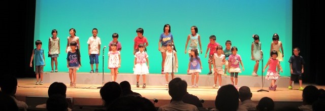 子ども園(新城市特有の、保育園と幼稚園が一緒になっているもの)の部、小学校低学年の部、小学校高学年と中学校の部の3つに分かれて、それぞれ違う歌を歌いました。5月ぐらいから教室の各レッスンで練習をしていました。後は「お家でCDを聞いて覚えてね」と言って、歌を覚えてもらっています。当日のリハーサルで初めて複数のレッスンの生徒たちが一緒になります。でも、みんながそれぞれしっかり練習しているので、いつもいいステージに仕上がってきています。